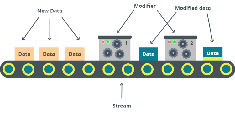 Data trong reactive programming sẽ được chứa trong một stream, các bạn có thể tưởng tượng một stream giống như một cái băng truyền ở trong ảnh trên vậy. Khi stream nhận vào một gói data mới, gói data đó sẽ được stream vận chuyển đến các modifier. Modifier là các function, nghiệm vụ của các modifier là chúng sẽ react(hay phản ứng) với các gói data được stream đưa vào, thay đổi các gói data đó và trả lại cho stream các gói data mà chúng vừa thay đổi.