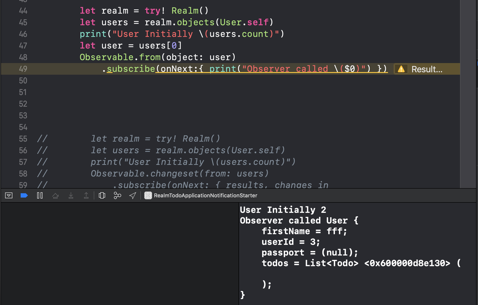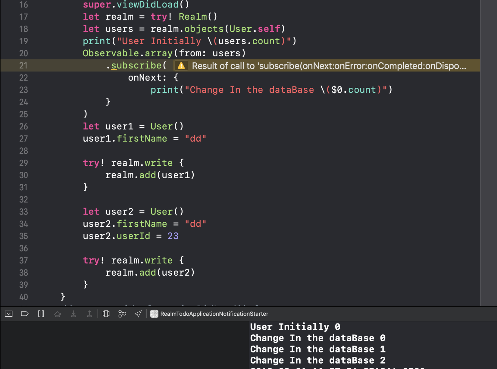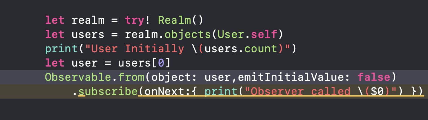 1 . Observable.array làm việc giống với Observable.collection nhưng nó sẽ trả về Swift Observable<Array<User>> thay vì Realm Observable<Results<User>>. Điều này hữu dụng khi business logic phụ thuộc vào array Swift thay vì Results của Realm