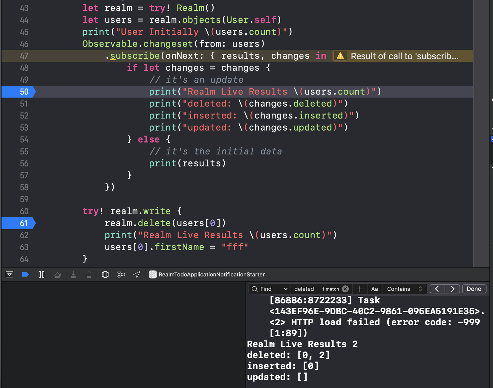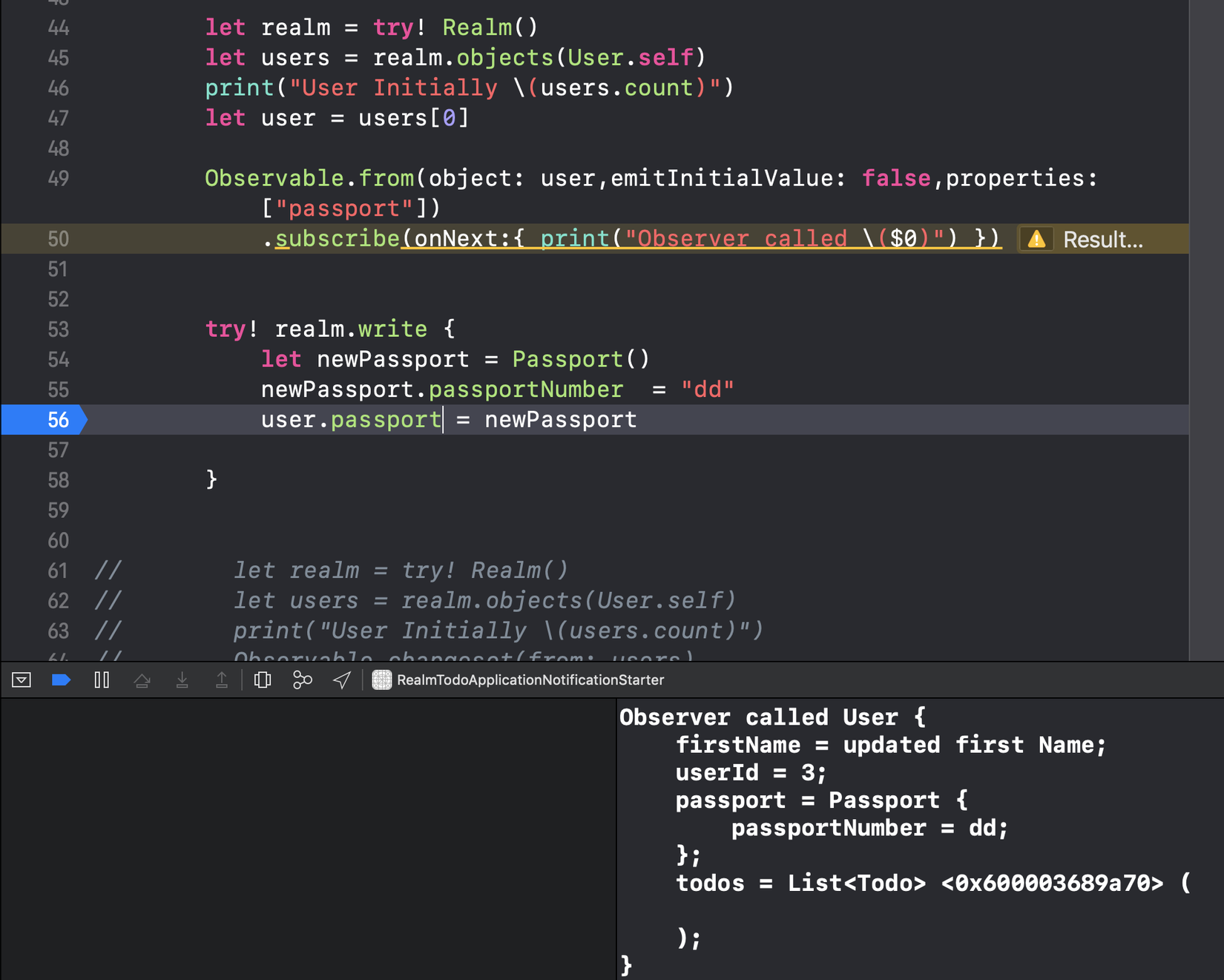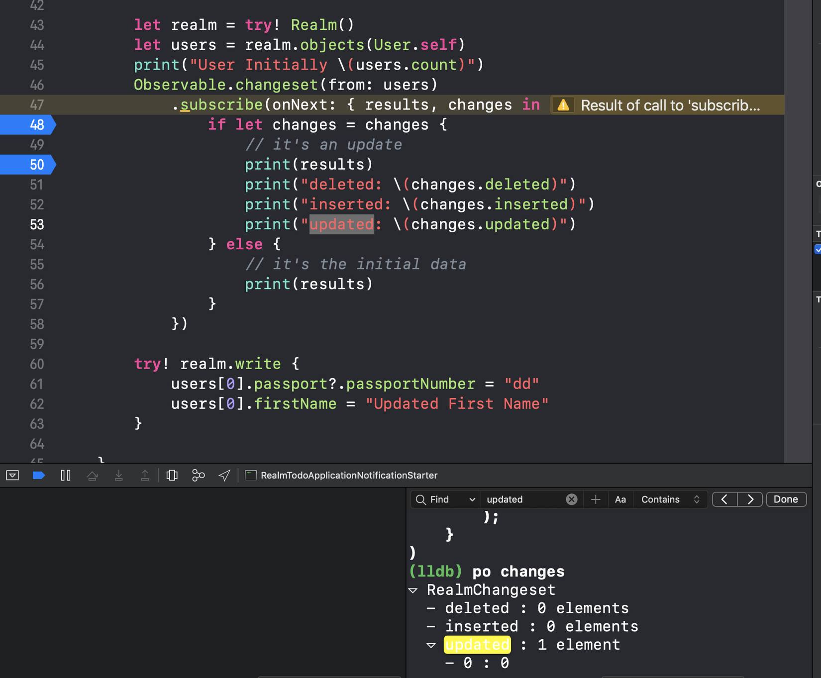 1 . Observable.array làm việc giống với Observable.collection nhưng nó sẽ trả về Swift Observable<Array<User>> thay vì Realm Observable<Results<User>>. Điều này hữu dụng khi business logic phụ thuộc vào array Swift thay vì Results của Realm
