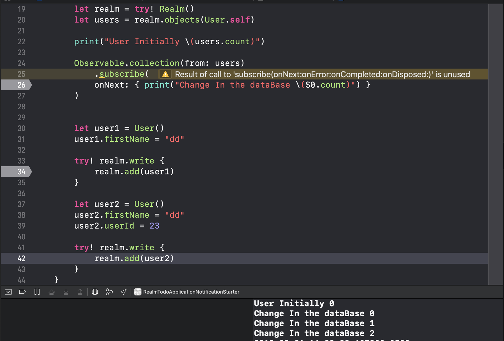 2 . Observable.collection trả về một Observable<E> trong trường hợp của chúng ta Observable<Results<User>> phát ra mỗi khi dữ liệu collection thay đổi . Oservable phát ra một giá trị khởi tạo khi đăng ký . Bạn sẽ không notify cho đến khi bạn đăng ký observable sử dụng phương thức *. subscribe *