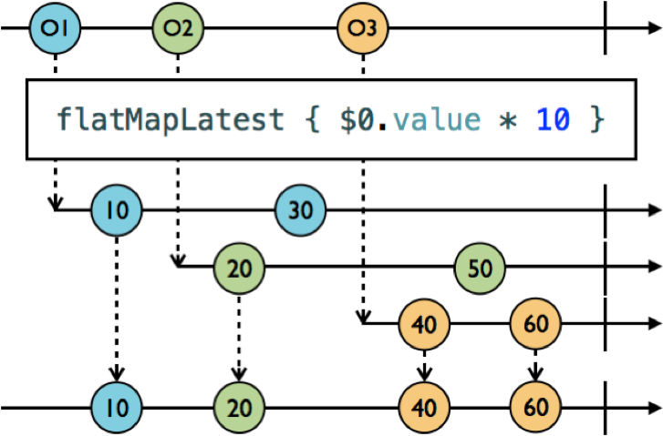 - Về cách thức hoạt động thì flatMapLatest tương tự như flatMap nhưng chúng ta chỉ có thể lắng nghe các sự kiện của chuỗi Observable nằm trong element cuối cùng của Source Observable.