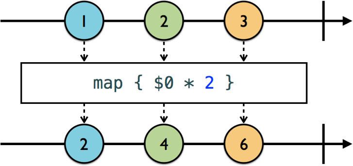 - .map dùng trong các trường hợp đồng bộ (synchronized), không phải chờ. Tức là mỗi khi nhận vào một element thì việc biến đổi element này ngay lập tức sẽ được thực hiện. Từng element sẽ được biến đổi tuần tự thông qua operator map.