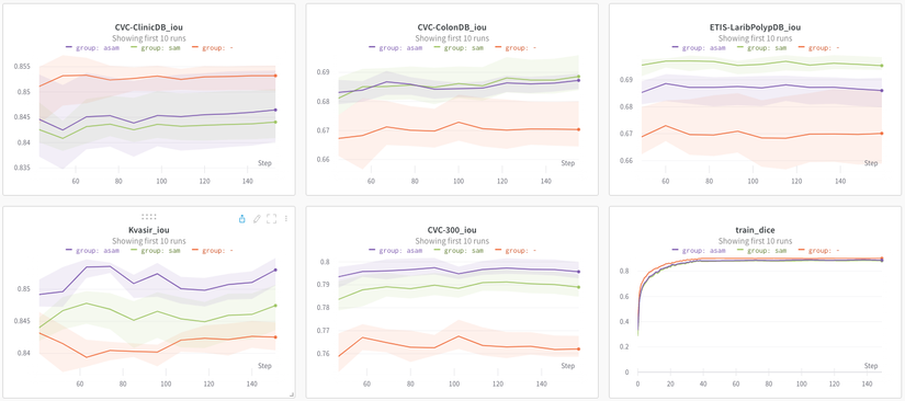 Để xác thực tính hiệu quả của giải thuật SAM. Mình đã áp dụng SAM và ASAM vào bài toán polyp segmentation. Hình 3 thể hiện kết quả đánh giá mô hình huấn luyện trên cả tập train và 5 tập test. Cả mô hình huấn luyện với SAM và ASAM đều cho độ chính xác thấp hơn trên tập train so với baseline chỉ dùng SGD. Tuy nhiên, cả hai mô hình này đều tất hơn baseline trên 4/5 tập. Cho thấy hiệu quả vượt trội của SAM so với baseline. Một điều nữa là mỗi thí nghiệm đều được thực hiện 5 lần, và mô hình train với SAM và ASAM có variance thấp hơn hẳn so với baseline. Đều này giống với tính chất mà tác giả nêu ra là tính reproducibility của mô hình train với SAM sẽ được cải thiện.