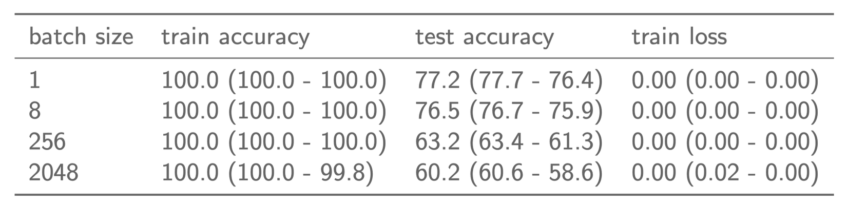 Có một thực tế là không phải tất cả các minima có giá trị loss trên tập train bằng nhau đều lại kết quả trên tập test tương đương nhau. Bảng 1 cho thấy kết quả huẩn luyện mô hình CNN trên tập CIFAR10 với các batch size khác nhau. Trong cả 4 trường hợp train loss đều xấp xỉ bằng 0 và train accuracy đều là 100%. Tuy nhiên, test accuracy ở các trường hợp lại có sự khác nhau rõ rệt. Như vậy, chỉ dựa vào loss để đánh giá một mô hình được huấn luyện tốt hay chưa là chưa đủ. Một mô hình được cho kết quả rất tốt trên tập train có thể cho kết quả rất tệ trên tập test. Trong trường hợp đó, mô hình có tính tổng quát hoá không tốt.