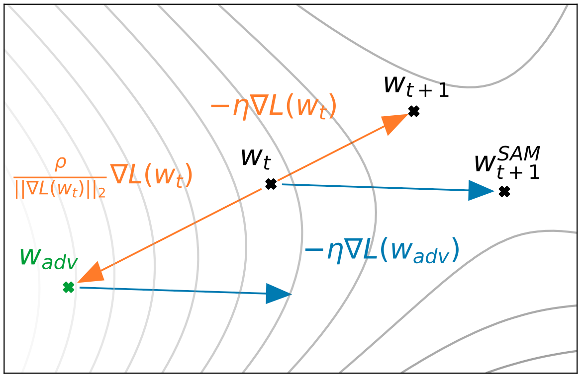 Hình 2 mình hoạ giải thuật gradient descent thông thường (từ sang ) và SAM (từ sang . Giải thuật gradient descent thông thường được sẽ update trọng số theo ngược chiều gradient bằng cách trừ tích của gradient với giá trị learning rate . Giải thuật SAM trước tiên tính (adversarial) bằng cách cộng với (là gradient được scale norm theo ). Mục đích tính là vì SAM kỳ vọng giá trị loss tại giá trị này sẽ có giá trị gần với giá trị loss lớn nhất xung quanh . Sau đó, ta tính gradient tại sau đó apply gradient này tại . Với các bước thực hiện như vậy, SAM hướng tới tìm vừa có loss tại đó nhỏ và loss tại những giá trị xung quanh cũng nhỏ.