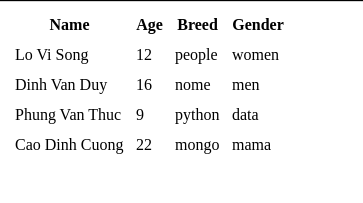 Mình có 4 hàng và 4 cột Name, Age, Breed, Gender và dùng vòng for để lặp lại các hàng để hiển thị ra dữ liệu.