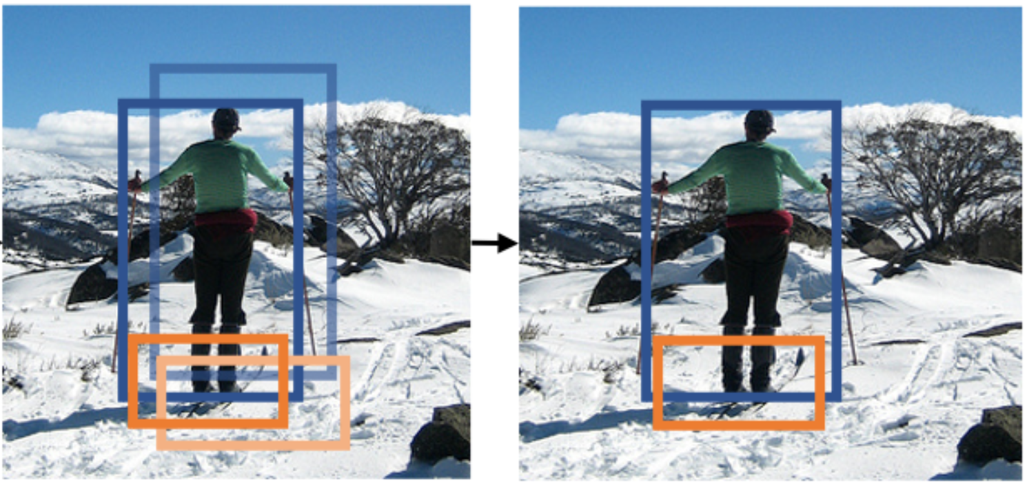 Một vấn đề mà các phương pháp thường gặp phải là mô hình tạo ra các box dư thừa trong quá trình dự đoán. Cụ thể, mô hình thường predict nhiều box cho một object (duplicate predictions). Nếu không xử lý thì điều này sẽ làm giảm độ chính xác của mô hình. Kết quả mong đợi của bài toán là mỗi object chỉ được predict một lần. NMS có lẽ là một trong những phương pháp đầu tiên được sinh ra để giải quyết vấn đề này. Hình 1 minh hoạ kết quả của mô hình trước và sau xử lý NMS. Từ hình ta có thể thấy mỗi object người và ván trượt đều được predict hai lần. Sau khi đưa kết quả của mô hình qua NMS, dựa vào độ tin cậy/độ tự tin của từng box và IoU (Intersection over Union, tỷ lệ phần giao cho phần hợp của hai box) giữa các box, NMS giúp mô hình loại bỏ hai box kém chính xác.