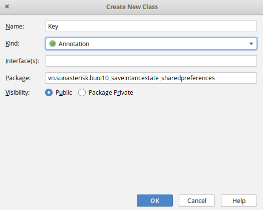 Mục đích là tạo ra các Key dùng trong project Các bạn tạo 1 class trong package chứa MainActivity : New -> Java Class, gõ tên class là Key và tích chọn loại là @Anotation sau đó OK