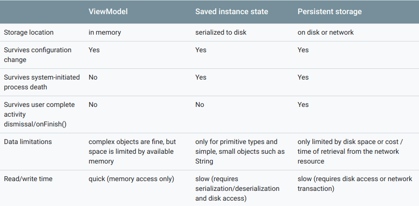 . Tức là trong trường hợp này chúng ta sẽ không thể sử dụng được ViewModel. Giải pháp của chúng ta sẽ là sử dụng onSaveInstanceState() hoặc mới hơn sẽ là ViewModel Saved State module.