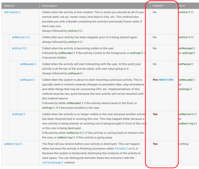 - 3, App của bạn bị put xuống dưới background và process của App bị kill: Trường hợp này thường chúng ta không để ý tới nhưng nó luôn là 1 nguy cơ tiềm tàng. Khi device cần thêm memory thì nó sẽ cần giải phóng memory hiện đang không dùng tới, nếu app đang ở trong background (onStop()) thì priority của Process của app sẽ bị giảm xuống. Activity và Fragment trong trường hợp này cũng sẽ bị finish nhưng khi bạn back lại app thì activity sẽ được recreate lại. Thường trong trường hợp này người dùng cũng như newbie sẽ không chú ý tới nhưng sau phía dưới thực sự đã diễn ra 1 quá trình finish và recreate lại Activity và Fragment của bạn.