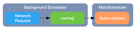 Một observable tạo 1 request đến server và nhận một số dữ liệu dữ liệu này sẽ được xử lý bởi một toán tử lưu trữ cached tại một vùng data nào đó. Dữ liệu này được truyền đến tất cả subscribers trên các scheduler khác nhau phần lớn có thể là trên MainScheduler để cập nhật lại giao diện người dùng