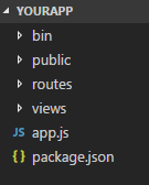 express --view=ejs yourappđể tạo mộtprojectmới với tên làyourapp. Mình dùng view-engine làejsnên mình để là--view=ejsnếu bạn dùngjadehaypug..v.v. thì sửa tham số nhé... - Sau đó, bạn sẽ được một project như dưới đây :