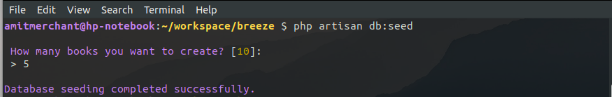 php Artian db: seed --class = BookSeeder, bạn sẽ được nhắc với câu hỏi "How many books you want to create ?”.Bạn chỉ cần nhập số record hoặc chỉ cần nhấn enter, thao tác này sẽ tạo ra 10 record theo mặc định.
