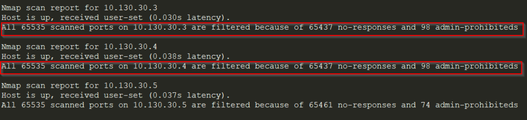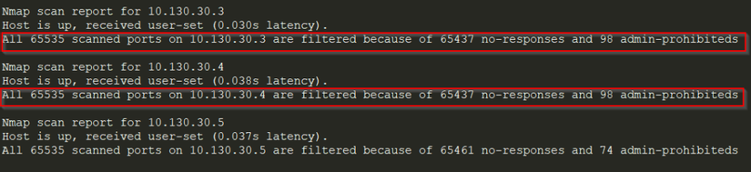 Đây có thể là khả năng tường lửa đang thả tất cả các gói tin. Kiểm tra và xác minh bằng cách kết nối với các cổng ngẫu nhiên (ví dụ 443, 80, 121, 89). Ví dụ: bạn có thể kết nối với cổng đó bằng cách đặt 10.130.30.3:443 vào trình duyệt và kiểm tra phản hồi. Nếu bất kỳ dịch vụ nào đang chạy trên cổng đó và nó đang phản ánh trên trình duyệt, thì cổng đó đang mở. Nếu không, nó sẽ được coi là đã lọc. Bạn cũng có thể kết nối thông qua netcat: $ netcat 10.130.30.3:443
