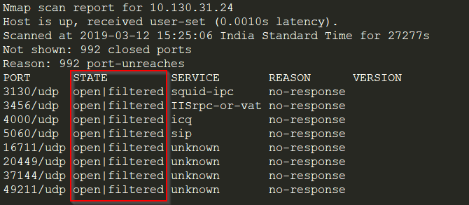 Tình huống trên rất phổ biến và chủ yếu xảy ra khi thực hiện quét UDP. Nmap gắn nhãn các cổng ở trạng thái này khi nó không thể xác định xem nó đang mở hay được lọc. Trong những trường hợp như vậy, hãy xác minh theo cách thủ công và kiểm tra xem nó có thực sự mở hay không.