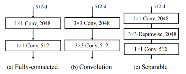 Self-attention cực kỳ hữu ích trong việc lưu trữ bộ nhớ long-term và shor-term trong 2D feature map. Tuy nhiên việc chồng nhiều lớp self-attention chỉ để lữu trữ thuộc tính short-term là điều không thực sự cần thiết. Chính vì vậy, nhóm tác giả đã thay lớp point-wise feedforward (1x1 Conv) (a) bằng Conv (b) cùng Depthwise (c).