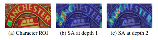 Tác giả công nhận rằng với ký tự 'M', lớp self-attention sẽ tiếp nhận được ký tự 'A' là tiếp theo. SA ở lớp 2 (depth 2) đã chuyển 'sự chú ý' đến ký tự tiếp theo, tận dụng được khả năng tính toán liên kết xa (long-range connection) của self-attention. Cũng nhờ lý do này, SATRN có khả năng đạt hiệu năng tốt cũng như lược bỏ các đặc trưng không cần thiết lặp lại (do convolutional encoder).