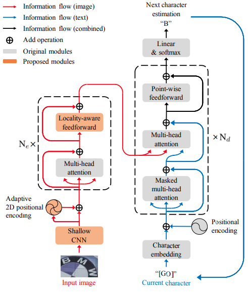 Encoder sẽ đưa ảnh qua khối Shallow CNN nhằm lấy được local pattern và texture. Feature map trích xuất sẽ được đưa qua module self-attention cùng với Adaptive 2D positional encoding. Khác với Transformer, tác giả đã thay pointwise feed forward bằng locality-aware feed forward layer.