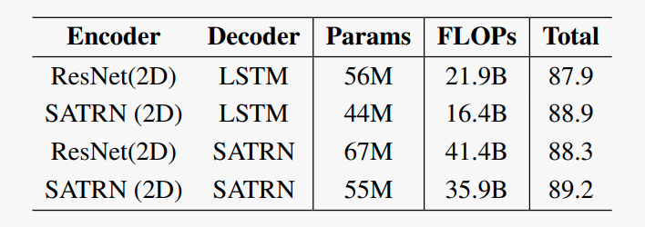 Bảng trên so sánh độ chính xác và hiệu quả (số lượng params và FLOPs) giữa các loại encoder và decoder khác nhau. Sử dụng SATRN (2D) ecoder có kết quả nhỉnh hơn ResNet encoder, và kết quả cũng tương tự khi thay LSTM decoder bằng SATRN trong khi cải thiện được hiệu quả về bộ nhớ cũng như hiệu năng (giảm 12 triệu params và 5.5 FLOPs). Kết quả này cho thấy encoder dựa trên self-attention có thể trích xuất nhiều thông tin feature maps từ ảnh hơn so với ResNet thông thường, đồng thời giảm được lượng tham số và chỉ số FLOPS. Phần decoder giữ nguyên cấu trúc của Transformer cũng cho accuracy cao hơn 0.3pp tuy nhiên lại tốn nhiều bộ nhớ và hiệu năng thấp hơn (tăng 11M params và 19.5 FLOPs).