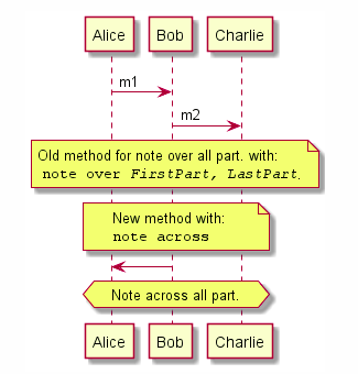 note over Alice, Charlie: Old method for note over all part. with:\n ""note over //FirstPart, LastPart//"".