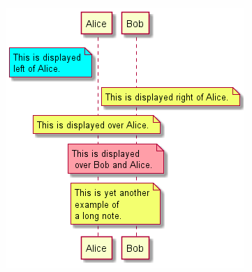 note over Alice, Bob #FFAAAA: This is displayed\n over Bob and Alice.