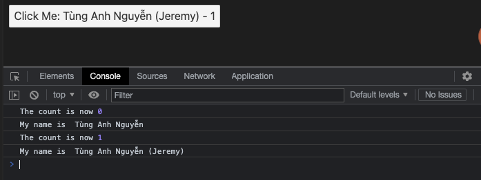 Tiếp sau đấy mỗi lần chúng ta click vào button Click Me thì giá trị số đếm count() sẽ tăng lên 1 đơn vị --> cũng đồng nghĩa với việc xảy ra 1 side effect (phản ứng phụ) console.log("The count is now", count())