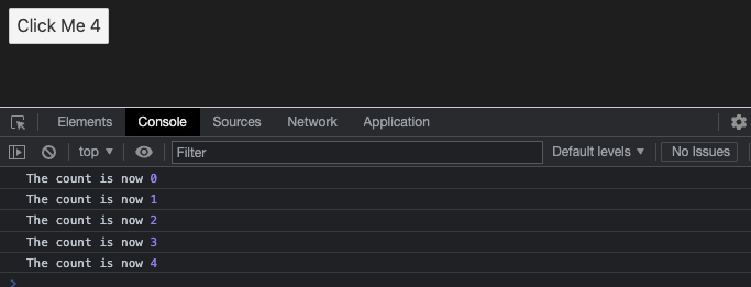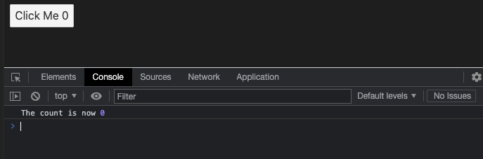 Trước khi chúng ta click vào button Click Me thì side effect này đã được thực thi và nó đã console.log("The count is now", count()) ra giá trị khởi tạo (initial value) ban đầu chính là số 0