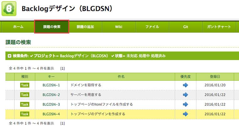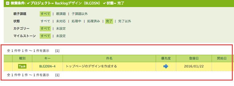 Kết quả tìm kiếm sẽ hiển thị với các điều kiện tìm kiếm mặc định. Điều kiện tìm kiếm mặc định là tất cả các task mà có trạng thái không phải là 「完了/Hoàn thành」, vì vậy, danh sách hiển thị là các task chưa hoàn thành.