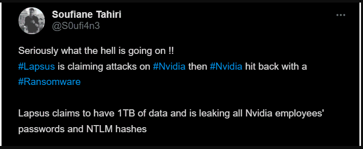 Vào ngày 23 tháng 2, Nvidia đã trải qua một cuộc tấn công ransomware bởi băng đảng hacker Lapsus. Nhóm này đe dọa sẽ tiết lộ dữ liệu trị giá 1TB trừ khi tiền chuộc được trả trước ngày 4 tháng 3. Thông tin bị đánh cắp bao gồm thông tin đăng nhập của nhân viên và dữ liệu độc quyền công ty, chẳng hạn như mã nguồn. Mặc dù chưa được xác nhận, Lapsus sau đó đã cáo buộc Nvidia hack ngựợc lại băng đảng này. Do đã sao lưu dữ liệu Lapsus không bị ảnh hưởng bởi vụ hack. Dữ liệu của Nvidia kể từ đó cũng bị rò rỉ và Nvidia thông báo rằng họ đang trong quá trình phân tích dữ liệu bị rò rỉ.