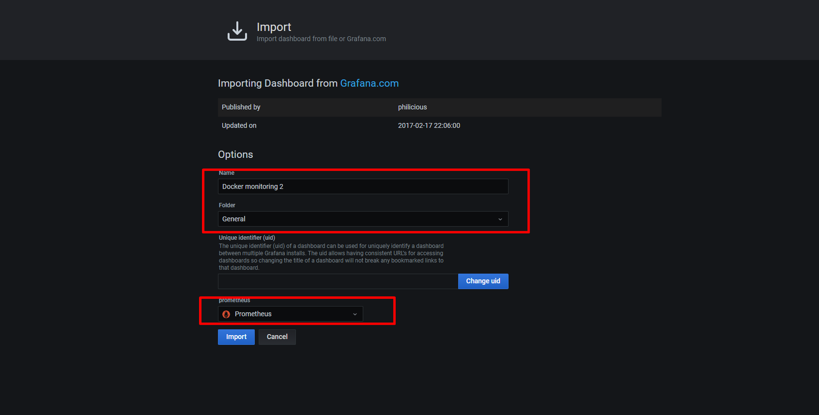 Mật khẩu và tài khoản mặc định là admin:admin sau khi đăng nhập ta chọn Dashboard => Manage => Import chọn import via grafana.com điền id dashboard là 1860(node-exporter) và 193(cadvisor) sau đó click Load và điền name, folder, datasource prometheus như sau.