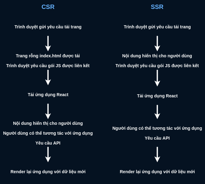 Chúng ta xem xét trình tự các sự kiện khi tải ứng dụng CSR và SSR.