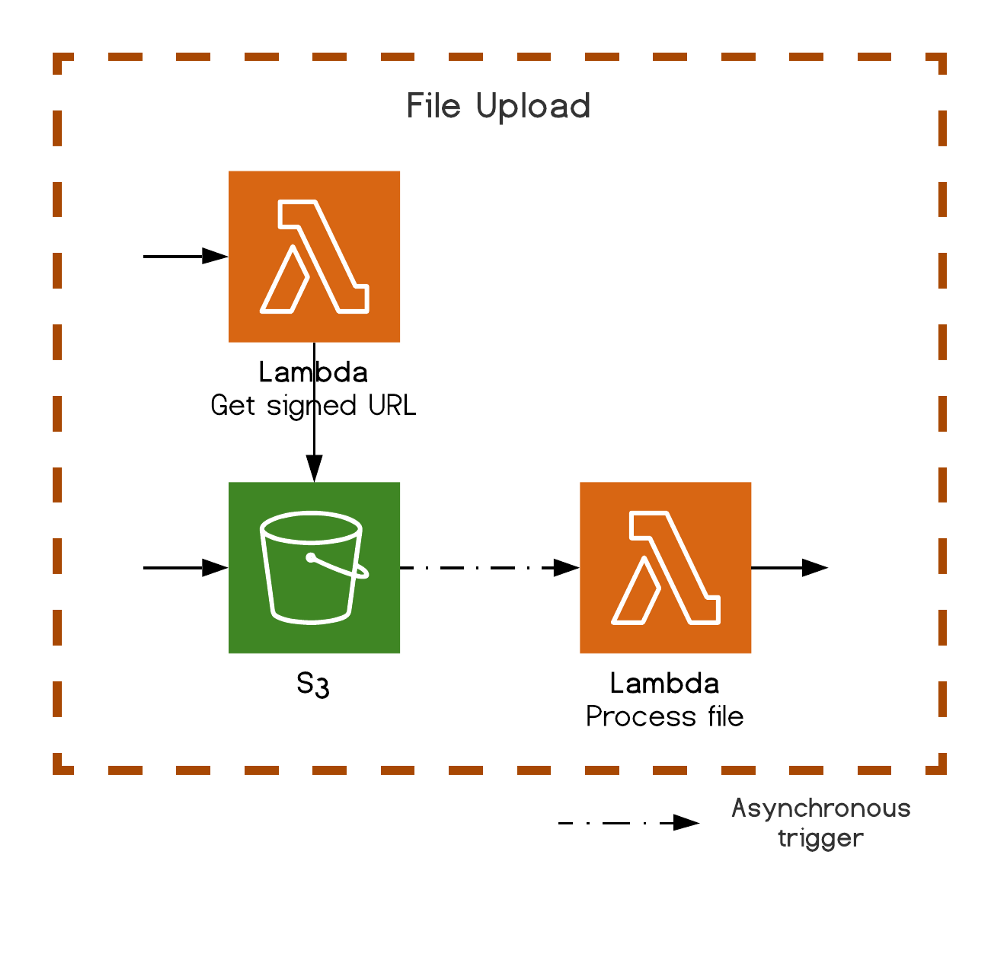 Thay vì xử lý luồng file upload từ Lambda, có thể rất tốn kém, thì S3 cung cấp khả năng cho Lambdas tạo signed upload URL (được bảo mật), sẽ được sử dụng bởi giao diện người dùng để trực tiếp tải tệp lên S3. Như hầu hết các dịch vụ AWS, phần thú vị là Lambda không đồng bộ khác có thể lắng nghe một sự kiện thay đổi tệp S3 để xử lý mọi hoạt động tiếp theo.