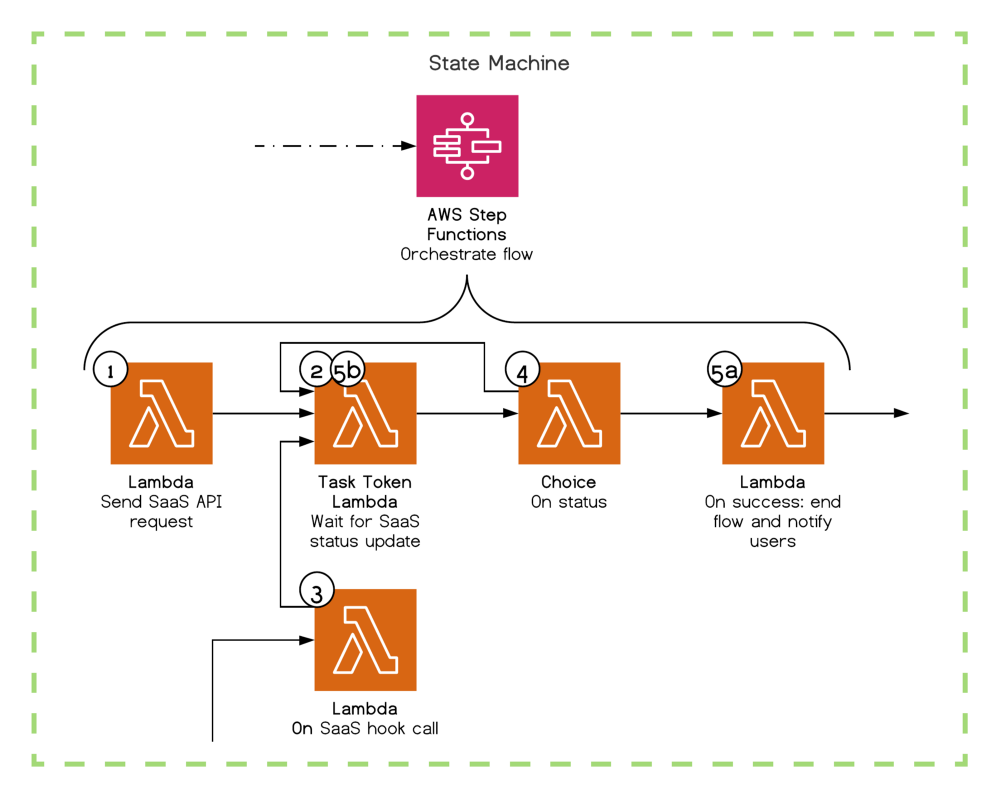 - Step 5 (cuối cùng) - Lambda: dựa trên campaign đã được gửi, cập nhật người dùng. Bài viết này giải thích chi tiết cách thức hoạt động của Task Tokens.
