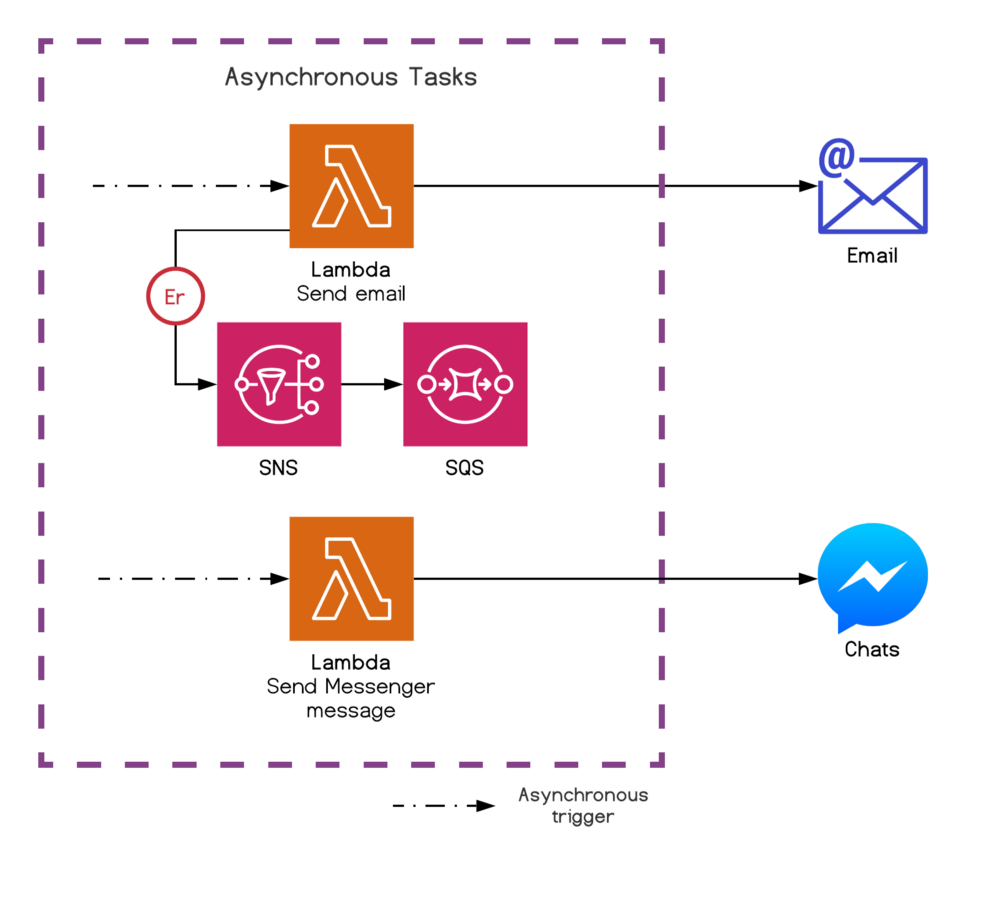 Xử lý lỗi là rất quan trọng trong một hệ thống không đồng bộ phân tán. Vì vậy, đối với Lambdas async, chúng tôi sử dụng Dead Letter Queue (DLQ) và chuyển thông báo lỗi cuối cùng đầu tiên cho Simple Notification Service (SNS) sau đó chuyển nó đến Simple Queue Service (SQS). Chúng tôi phải làm điều đó ngay bây giờ vì nó chưa thể gắn trực tiếp SQS vào DLQ Lambda.