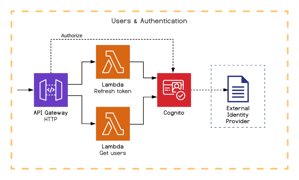 Trong ví dụ của chúng tôi, minh họa khả năng liên kết người ủy quyền Cognito với các tuyến đường API Gateway của chúng tôi. Chúng tôi cũng đã tiết lộ một Lambda để làm mới mã thông báo xác thực và một Lambda khác để lấy danh sách người dùng.