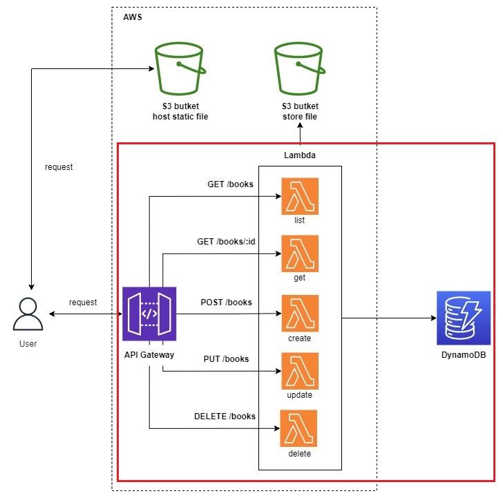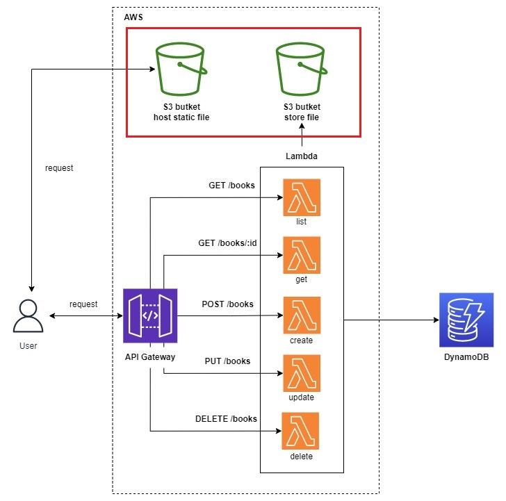 Trong bài này thì mình sẽ dùng Terraform để tạo ra hệ thống ở trên, nên ta không cần phải tạo từ đầu, nếu các bạn muốn biết cách tạo bằng tay theo từng bước thì các bạn đọc ở bài trước. Bước tiếp theo là ta sẽ gắn thêm hai S3 bucket vào nữa, một bucket để ta lưu trữ hình ảnh, ta sẽ viết code cho Lambda function để nó có thể save file được upload từ website vào S3. Và một bucket để ta hosting một trang web dạng single page application, trang web này nó sẽ gọi API tới API Gateway của ta và lấy dữ liệu từ DynamoDB ra để hiển thị.