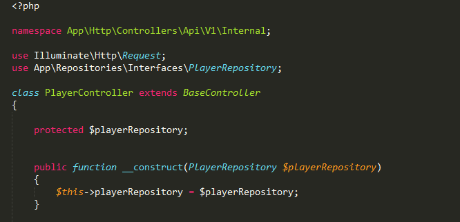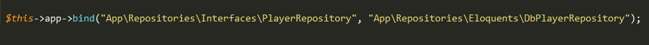 Ta có PlayerController muốn sử dụng các function trong class DbPlayerRepository thì ta chỉ việc type-hint interface PlayerRepository trong hàm construct, Service Container sẽ tự động inject class DbPlayerRepository.