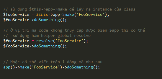 Dòng code trên thể hiện việc lấy lại các instance của các class đã bind với container. Chúng ta sẽ thấy dùng Service Container làm cho code clear hơn, không phải khởi tạo các hàm, mà chúng ta có thể resolve từ bất cứ vị trí nào trong ứng dụng.