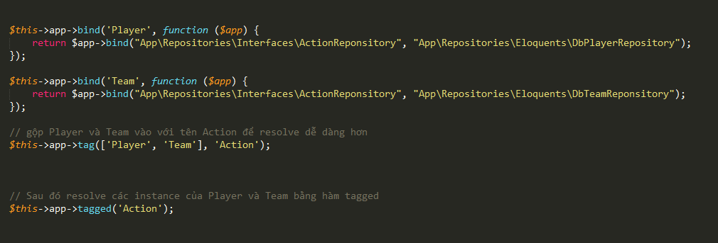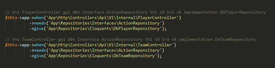 Chắc các bạn sẽ thắc mắc, tại sao chúng ta phải type-hint interface PlayerRepository mà không gọi trực tiếp class DbPlayerRepository? Bởi vì 1 interface thì có thể có nhiều impelentation, khi ta type-hint interface thì chúng ta có thể linh hoạt thay đổi được các implementation mà mình mong muốn. Vậy để xử lý việc này thì đã có Contextual Binding hoặc Tagging