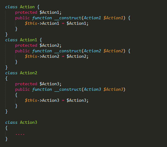 Khi chúng ta có 1 class Action có dependency là class Action1, class Action1 có dependency là class Action2, class Action2 có dependency là Action3... Các class cứ phụ thuộc chồng chất lên nhau. Vậy để khởi tạo class Action chúng ta phải chuẩn bị tất cả các class dependency của nó. Đây cũng là điểm yếu rất lớn của dependency injection.Lúc này Service Container sẽ vỗ ngực và nói mọi thứ cứ để anh l, chúng ta sẽ không phải lo gì hết vì Service Container sẽ tự động inject tất cả những class mà bạn cần.