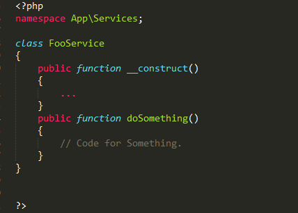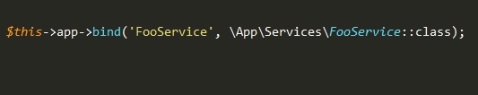 Dòng code trên thể hiện việc đăng ký class FooService vào container với cái tên FooService. Tuy nhiên có những cách khác để bind 1 class vào container tùy vào cách sử dụng của từng trường hợp: