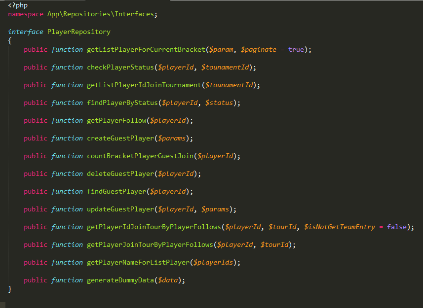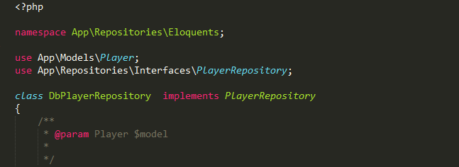 Chúng ta sẽ đi vào ví dụ cụ thể để có thể hiểu hơn nhé. Ta sẽ tạo một 1 interface PlayerRepository trong thư mục App\Repositories\Interfaces.