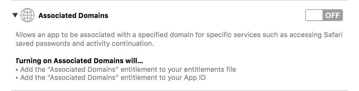 Trong Xcode <MyApp>.xcodeproj/<Build target>/Capabilities và bật Associated domains.