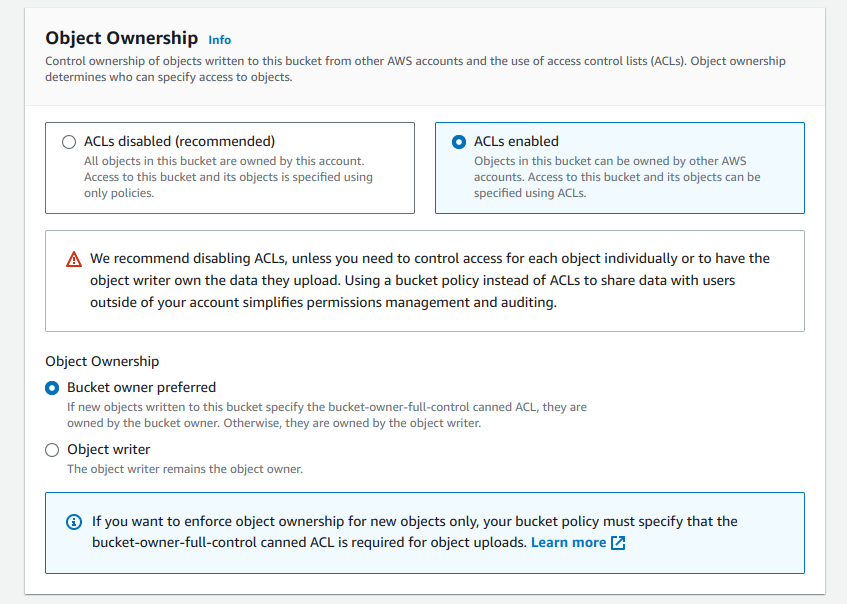 - Chúng ta sẽ lưu trữ các file như avatar, flash card illustration image theo dạng public nên sẽ bỏ chọn Block all public access và chọn ở warning kèm theo:
