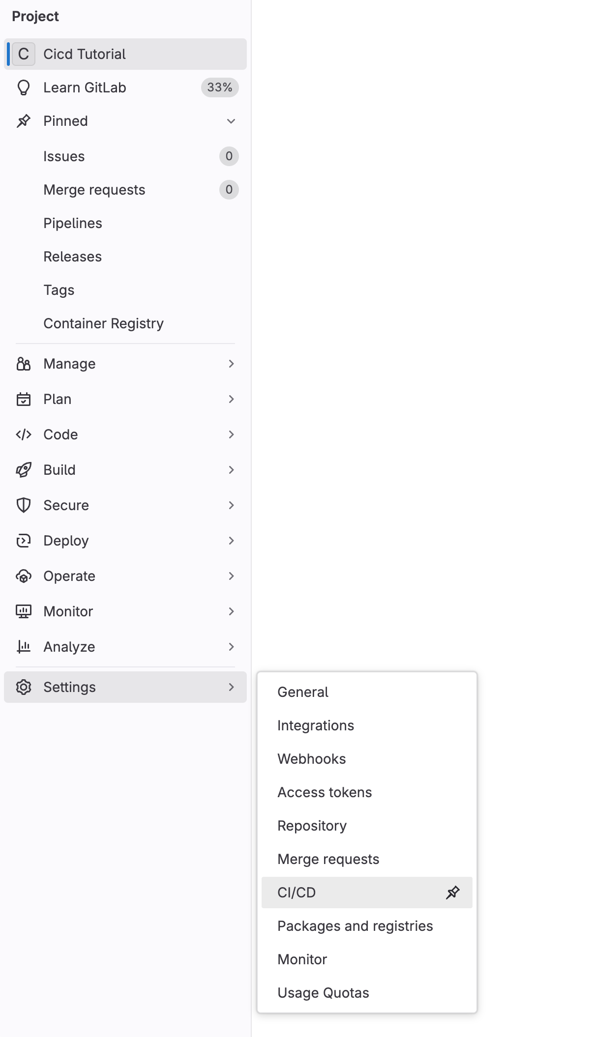 Vậy các biến $WORK_DIR, $SERVER_IP, $SSH_KEY sẽ lấy ở đâu và truyền vào những giá trị gì, chúng ta sẽ vào Settings => CI/CD
