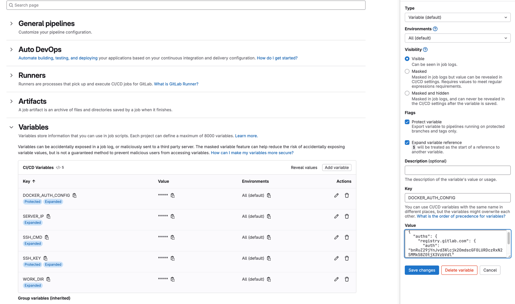 DOCKER_AUTH_CONFIGvào CICD Variables. Các bạn vào CICD Variables như trước đó đã làm vào tạo thêm biến DOCKER_AUTH_CONFIG, thêm giá trị bên dưới vào: