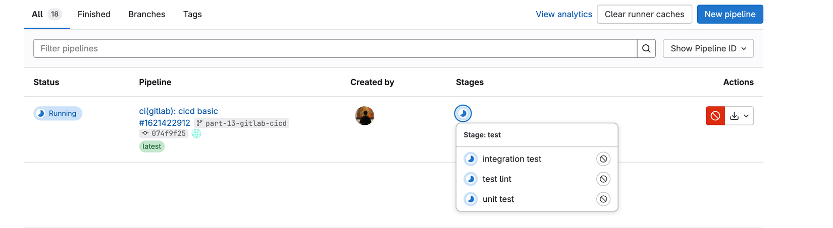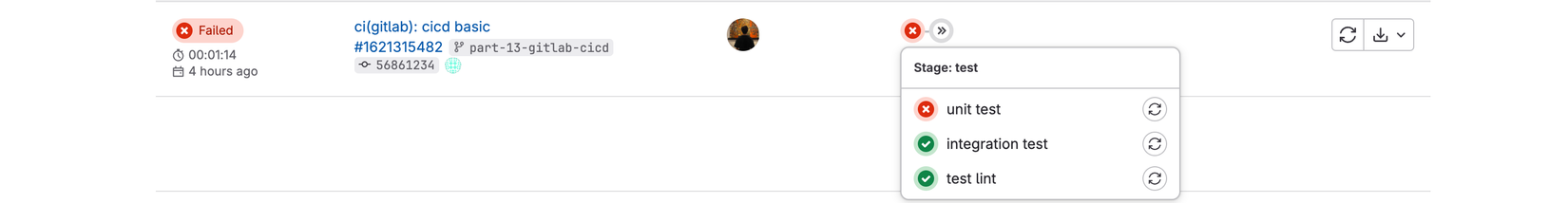 Nội dung hiển thị sẽ có 3 jobs thuộc Stages test, đúng với những gì chúng ta đã quy định ban đầu nếu branh không có chứa prefix deploy/ hoặc deploy/staging