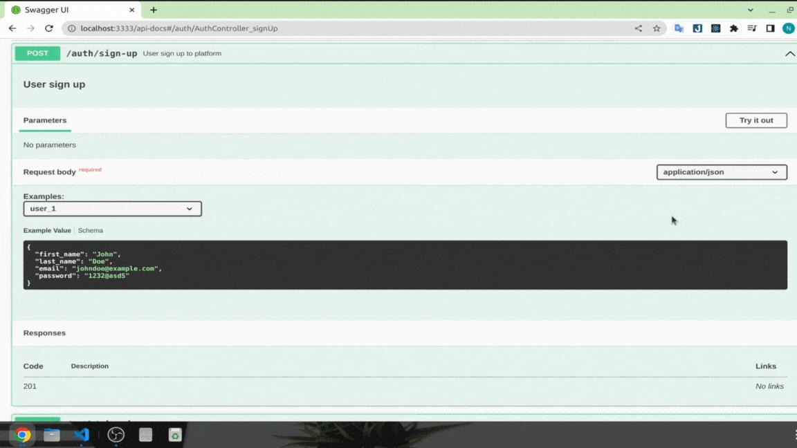 Với các payload dạng application/json chúng ta có thể sử dụng option examples để hiển thị nhiều dữ liệu mẫu giúp gọi API thuận tiện hơn. Ở trên mình đã tạo ra 2 user mẫu giờ việc sign-up chỉ cần chọn user là xong không cần mất thời gian nhập dữ liệu.
