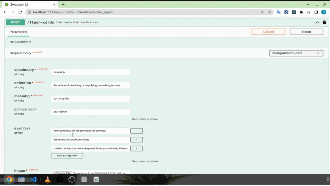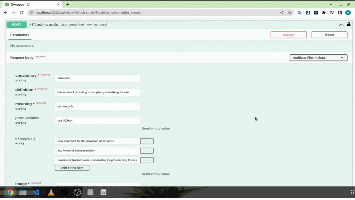 Mặc định với các API POST Swagger sẽ tự động lấy thông tin được khai báo từ DTO để generate thông tin ở request body (tương tự với response và schema). Ví dụ như hình dưới, mặc dù chúng ta chưa thêm gì từ Swagger vào API POST flash-card nhưng vẫn có thông tin request cũng như response.