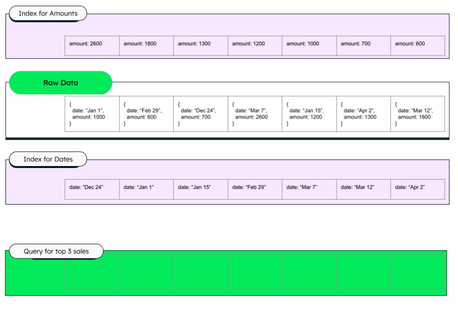 Querying top 3 sales without index, chúng ta phải lần lượt scan qua từng phần tử trongRaw datasau đó sắp xếp lại để tìm ra top 3 amount lớn nhất vì chúng ta không biết document đang được scan qua có phải nằm trong top 3 hay không, chỉ biết được top 3 khi đã scan qua toàn bộ phần tử - Trường hợp ngược lại,